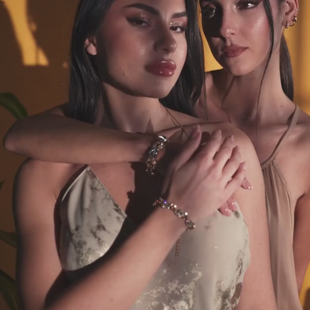 - La parte gioiello è composta da singoli castoni in ottone, saldati a mano, e sottoposti a galvanizzazione nickel free con protezione antiossidante, garantendo resistenza, eleganza e una bassa reattività allergenica.